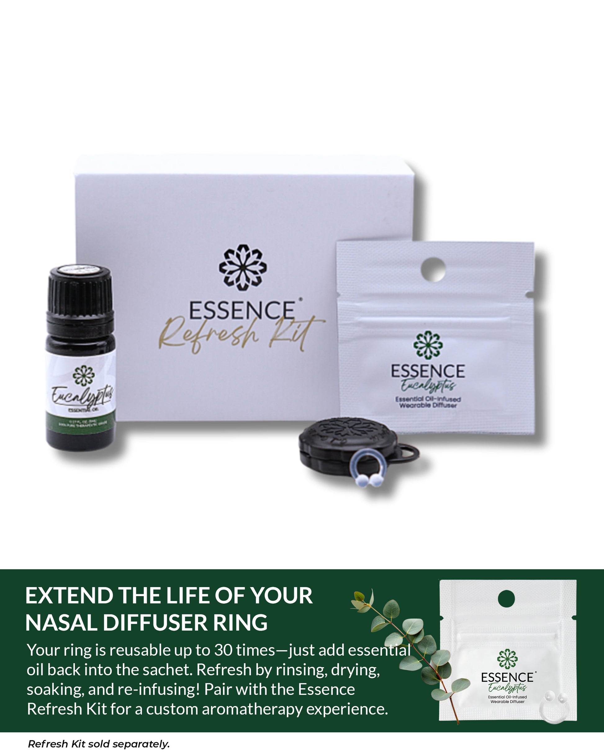 Infused with 100% pure, therapeutic-grade Eucalyptus (Eucalyptus globulus) essential oil on a soft, hypoallergenic silicone diffuser ring.