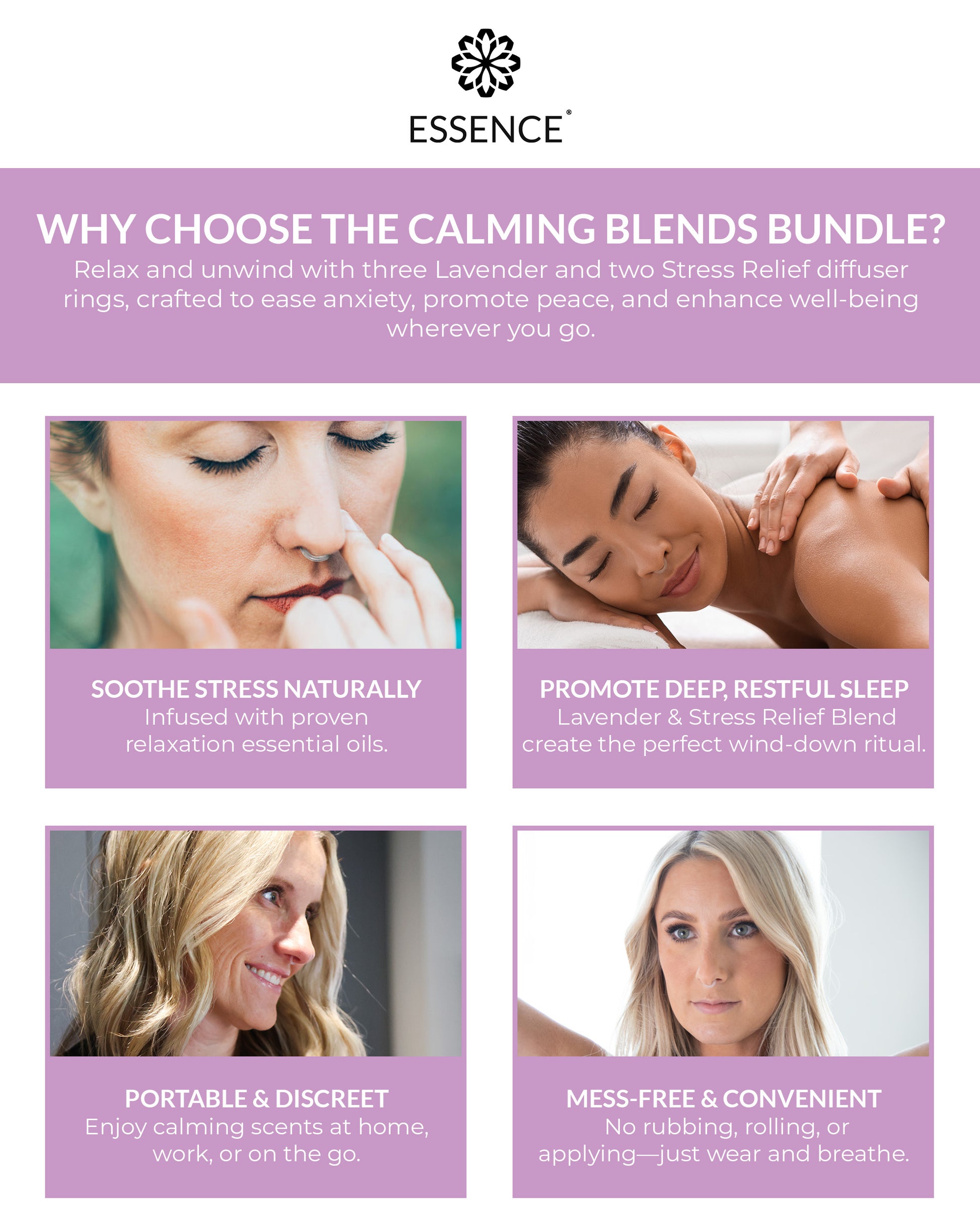 Discover your calm with the Calming Blends Bundle Pack — five diffuser rings infused with Lavender and Stress Relief Blends to promote relaxation, ease tension, and restore balance naturally.