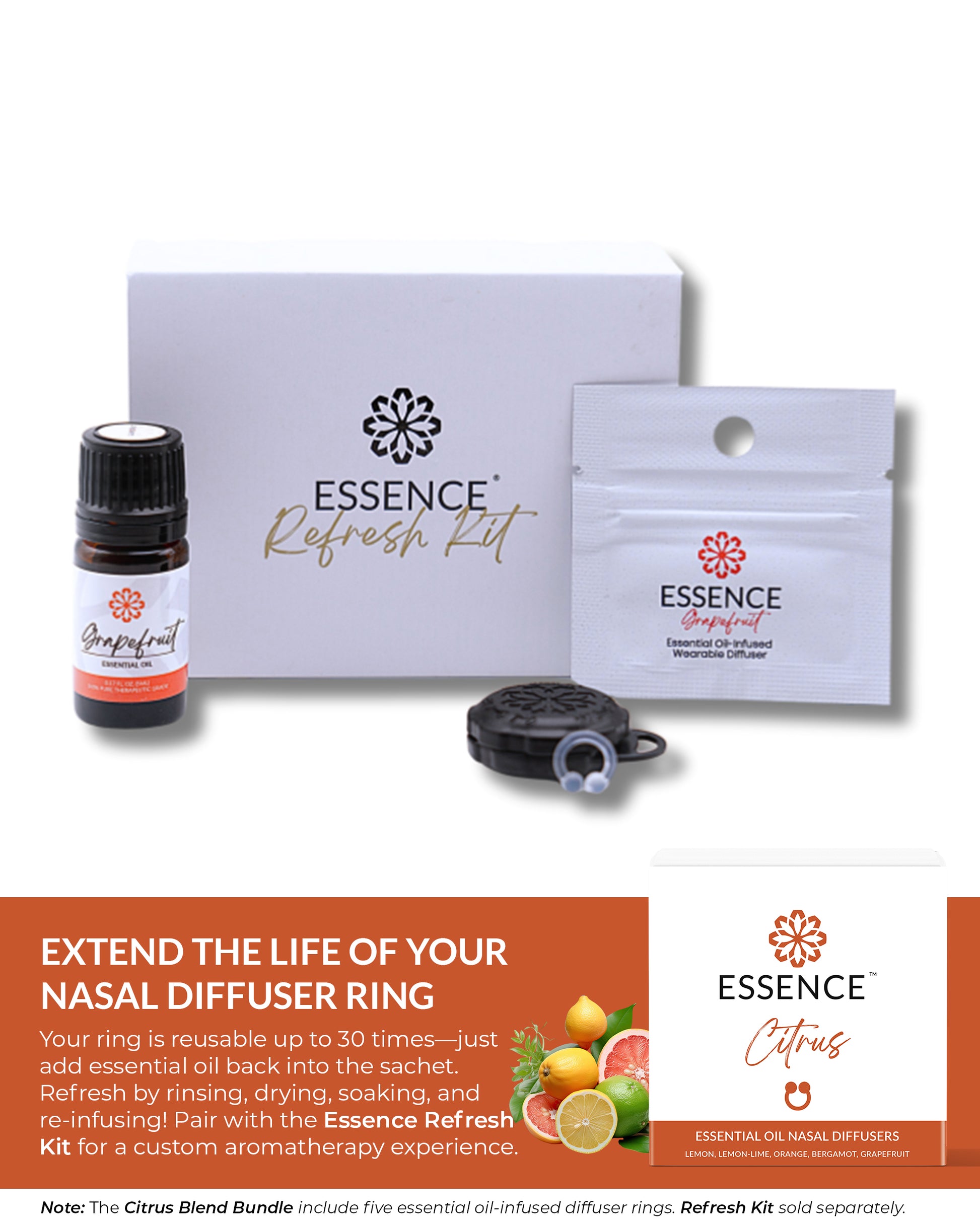 Includes five Essence Diffuser Rings, each infused with 100% pure, therapeutic-grade essential oils:
