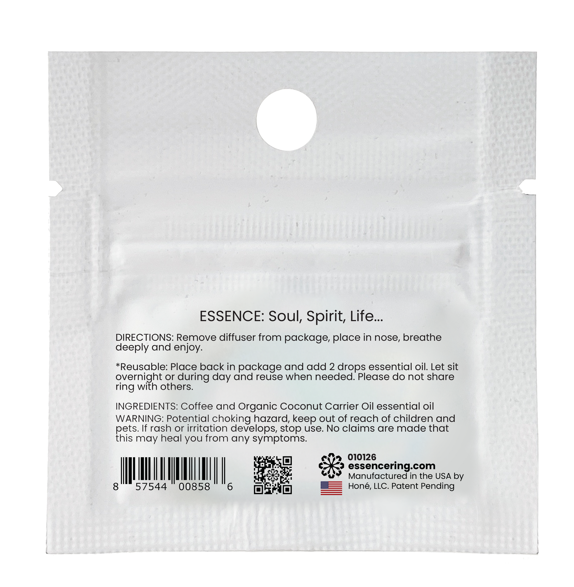 100% pure, therapeutic-grade Coffee (Coffea arabica) essential oil & Coconut Carrier oil infused into a soft, hypoallergenic silicone ring. Free from synthetics, parabens, and fillers.