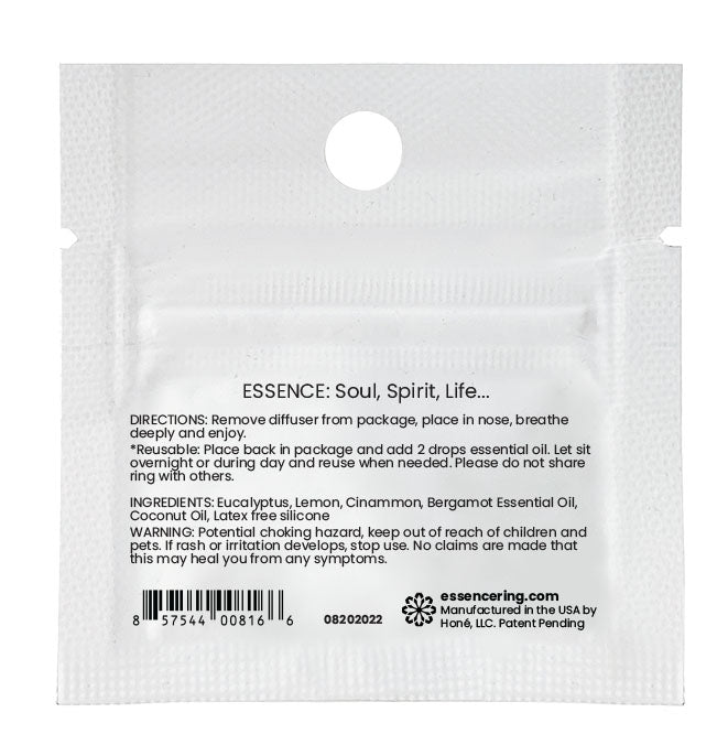 Infused with 100% pure, therapeutic-grade Eucalyptus, Bergamot, Lemon, and Cinnamon essential oils on a hypoallergenic silicone diffuser ring.