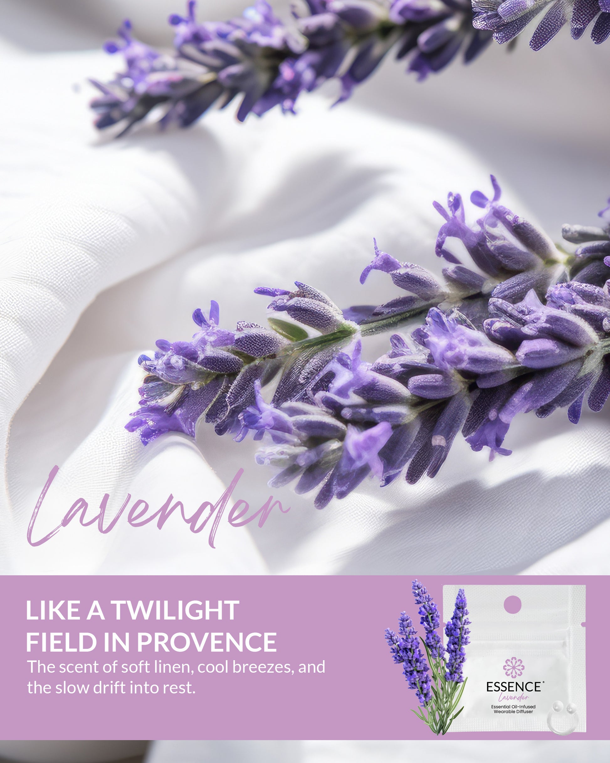 Infused with 100% pure, therapeutic-grade Lavender (Lavandula angustifolia) essential oil on a soft, hypoallergenic silicone diffuser ring.