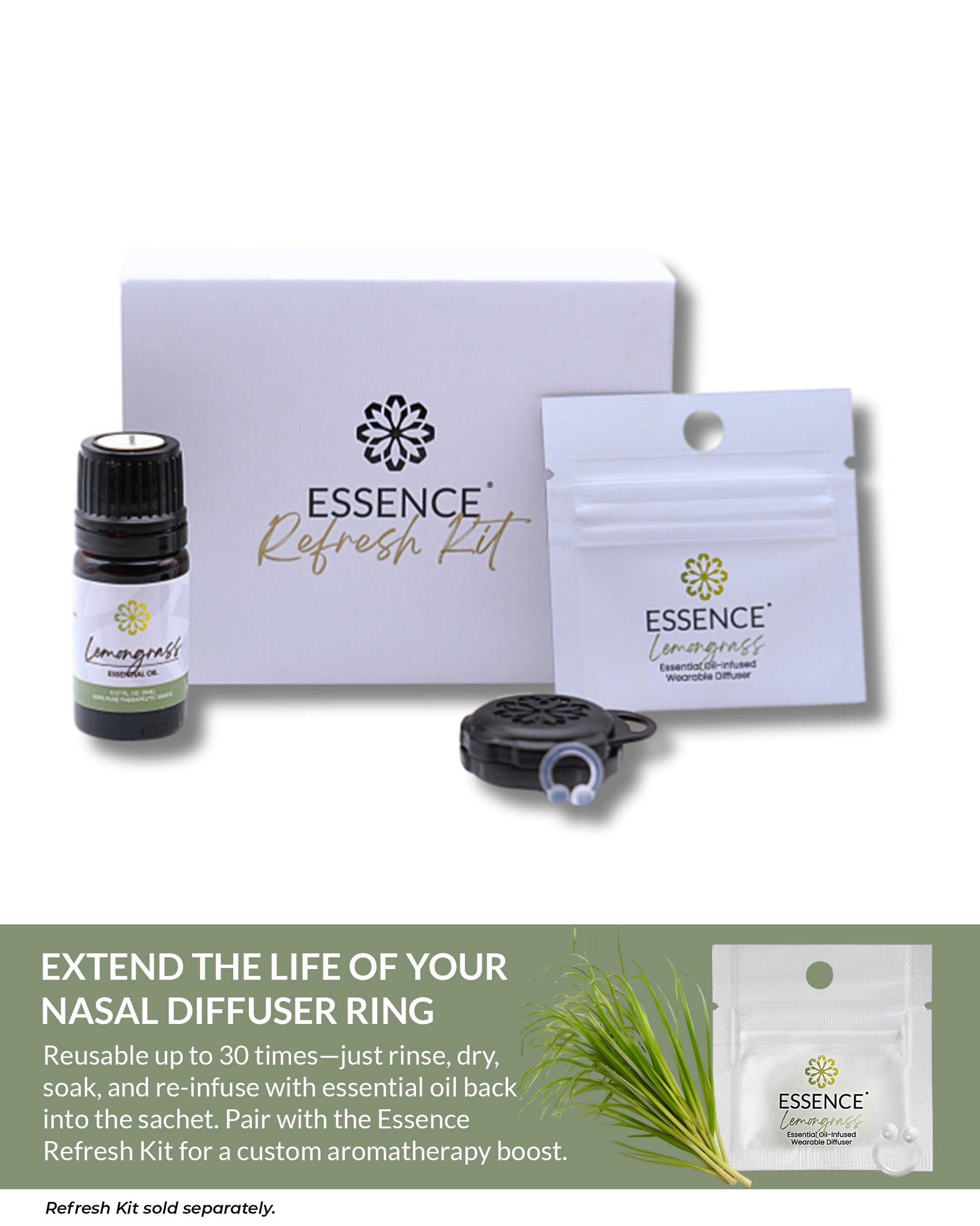 The Lemongrass Essence Ring delivers a clean, citrus-herbal lift designed to refresh your senses and clear your mind. Infused with 100% pure, therapeutic-grade lemongrass essential oil, this discreet nasal diffuser ring helps you feel brighter, more focused, and ready for the day.