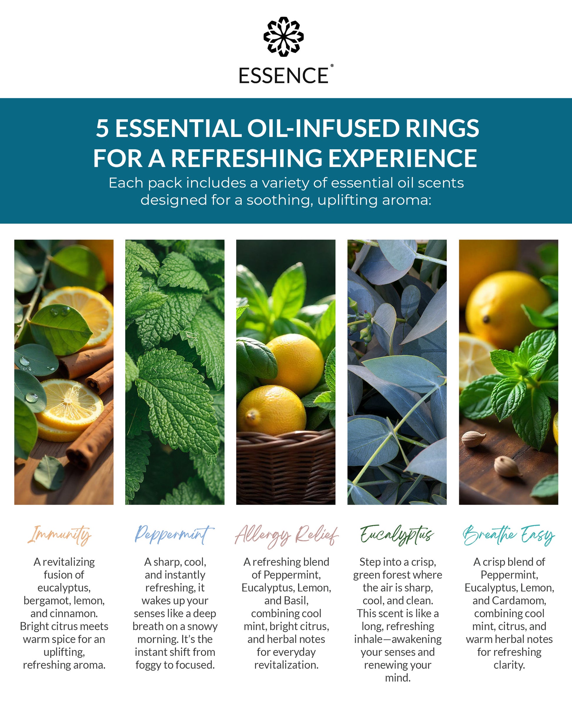 Includes five Essence diffuser rings infused with 100% pure, therapeutic-grade essential oils for respiratory health, including eucalyptus, peppermint, lemon, and other botanicals.